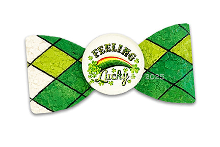 Shades of green and white argyle with a rainbow and clover center that says Feeling Lucky. Celebrating St. Patrick's Day in style! Stiffened for extended wear; Standard size, approx 2" wide.