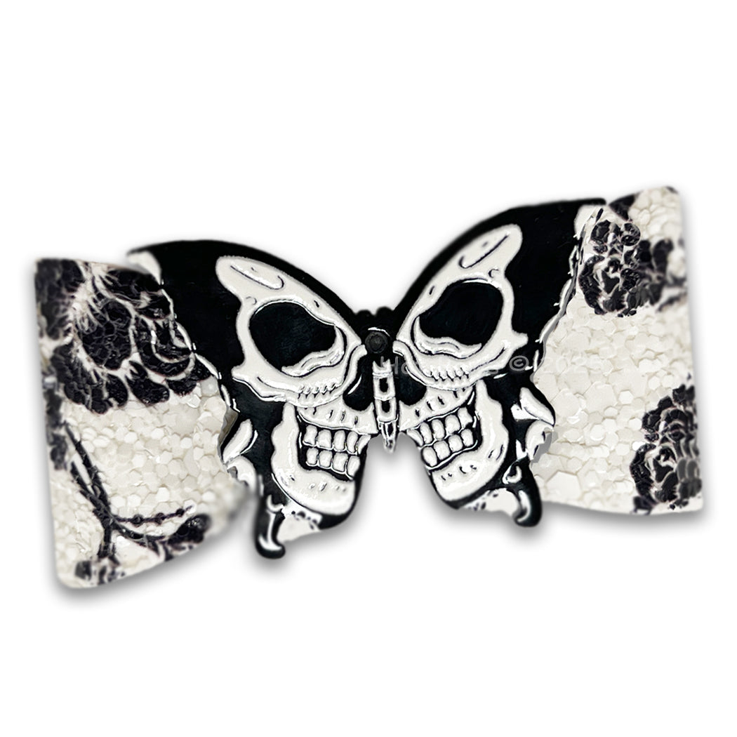 Make a bold statement with the Goth Moment bow. Designed for dogs who dare to show off their fearless style with playful attitude. A floral glitter fabric with a twinning skeleton center. Stiffened for extended wear. Standard size, approx 2" wide.
