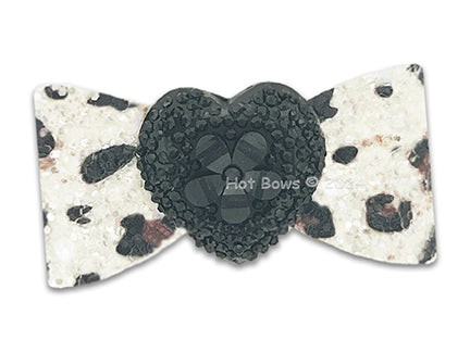 This bow has a black heart centerpiece with a floral pattern, set against a background with a glittery white and black leopard print. Stiffened for extended wear. Standard size 2" wide.