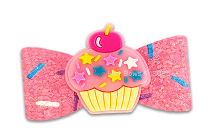 Pink glitter bow with colorful sprinkles, topped with a vibrant cupcake centerpiece featuring stars, a cherry, and playful details. Sweet for dogs! Stiffened for extended wear; Standard size, approx 2" wide.