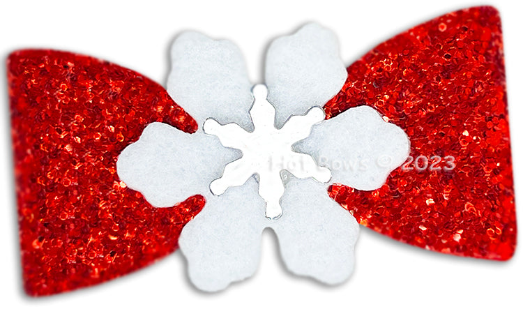 A large white and silver snowflake center on a spartly red glitter fabric. Stiffened for extended wear. Approx 2.5" wide.